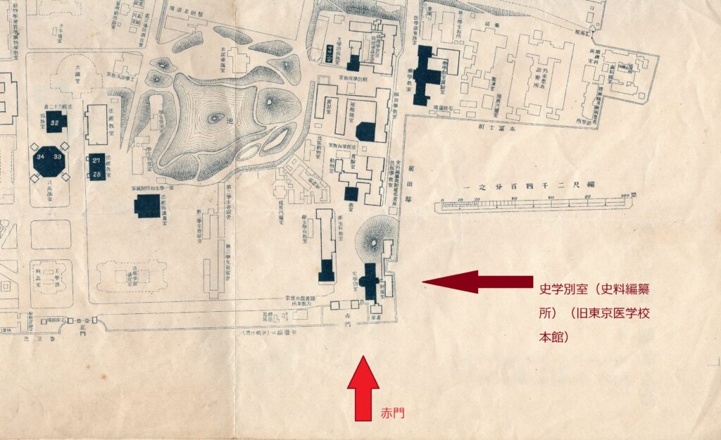 ♪旧東京医学校本館が,現在の経済学部のある場所,赤門を入って右手の位置に移築されて史料編纂所として使われていた時代がありました。三上参次の史料編纂所です。