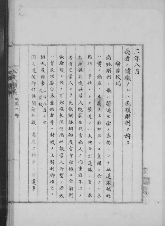 「病者ノ情願アレハ死後解剖ヲ許ス(明治二年八月)」