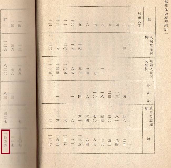 🌲〔解剖体数歴年統計〕によると明治2年(1869)に美幾の入院患者病屍解剖からはじまった解剖は、明治15年(1882)で、1456体。そのうち入院患者病屍によるものが126体、梟首及斬罪屍によるものは427体。森鴎外が学生だった明治13年(1880)当時は、総解剖数137体で無籍人及囚徒病者による解剖が115体と多くを占めていました。