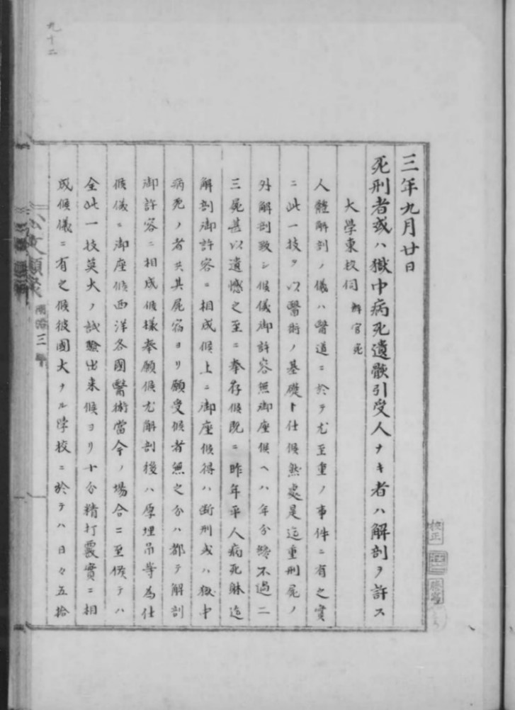 「死刑者或いは獄中病死遺骸引受人なき者は解剖を許す(三年九月廿日)」