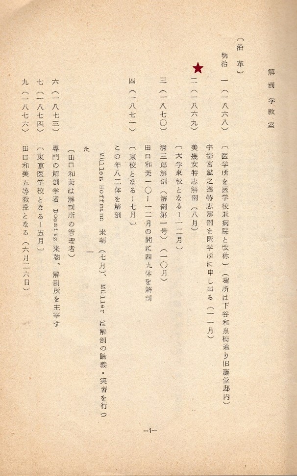 「・・・・・同月十四日和泉橋通旧医学所跡に設けたる仮小屋に於て、入院患者娼妓みき女の屍体を生前の請願に依りて、内臓より四肢の筋肉に至るまでを剖観しました。当代に於ける実地解剖の濫觴であります。けれども、此挙たるや所謂解臓と云ふべきもので、未だ次序逐節を追ひ、系統的に屍体を解剖したるものではありませんでした。」