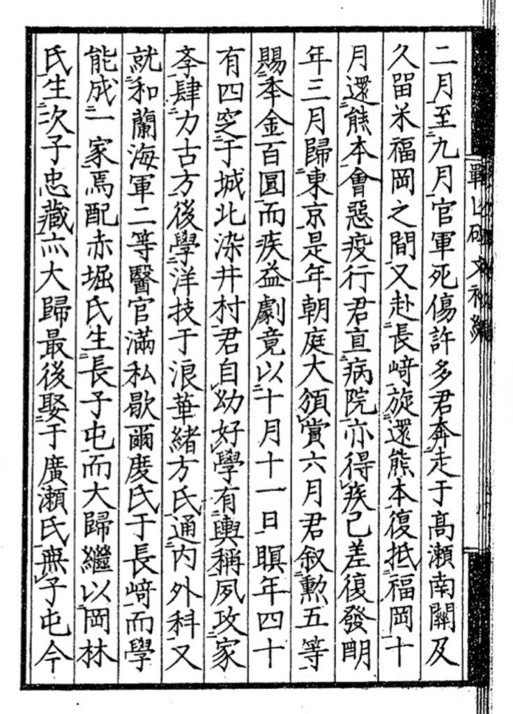 📕明治9年(1976)4月には熊本鎮台の第十三連隊第一大隊で軍医を務めています。このときの参謀に児玉源太郎(のち陸軍大将)がいました。