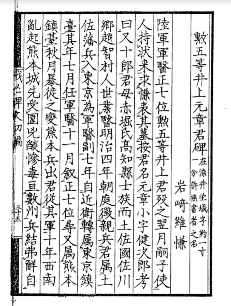 📕明治6年当時の熊本鎮台司令長官であった谷干城(たに・たてき)は、後年、訪ねてきた井上元章の息子・昆雄について、次のように懐述しています。